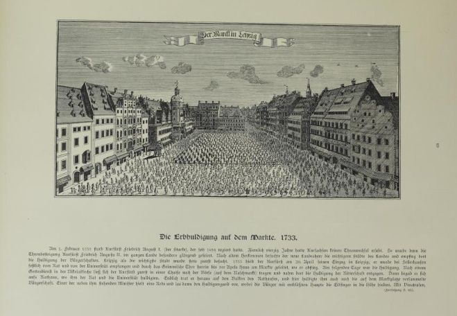 (Beitragsbild: Kupferstich der Huldigung 1733 auf dem Marktplatz zu Leipzig, in: Bilderbuch aus der Geschichte der Stadt Leipzig für alt und jung, Leipzig 1897, S. [68], https://digital.slub-dresden.de/id399285539/81)
